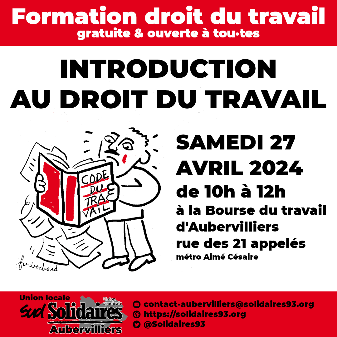 L’Union locale Aubervilliers des syndicats SUD-Solidaires organise régulièrement des formations gratuites en droit du travail ouvertes à toutes et tous.