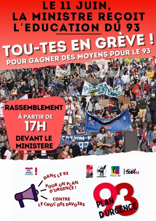 • faire grève le 11 juin afin de maintenir le rapport de force et obtenir des moyens à la hauteur des revendications du plan d’urgence pour l’éducation dans le 93 ;