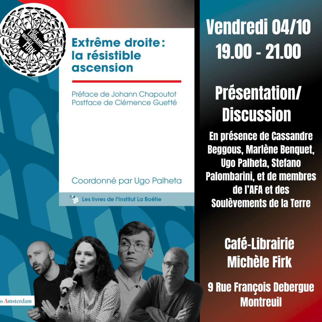 Rencontre organisée par le café-librairie Michèle Firk autour de « Extrême droite : la résistible ascension » en présence de Cassandre Begous, Marlène Benquet, Ugo Palheta, Stefano Palombarini, et de membres de l’AFA et des Soulèvements de la Terre.