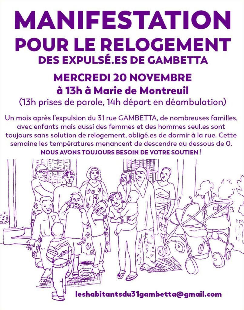 Appel du collectif des habitant⋅es du squat Gambetta, expulsé le 10 octobre dernier, à une manifestation ce mercredi 20 novembre à 13h devant la mairie de Montreuil pour exiger leur relogement.