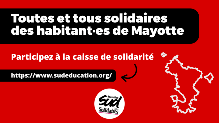 Face à l’urgence de la situation et pour soutenir les personnels de l’éducation, les élèves et leurs familles à Mayotte, SUD éducation lance une caisse de solidarité qui sera reversée à SUD éducation Mayotte.