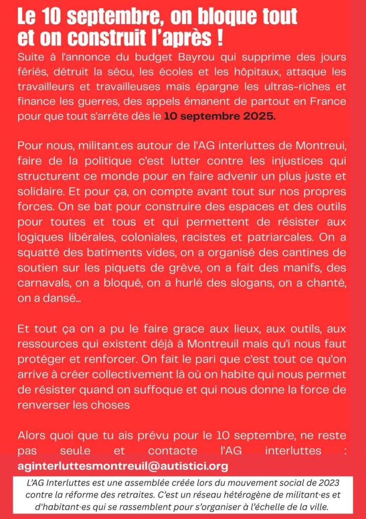 Suite à l’annonce du budget Bayrou qui supprime des jours fériés, détruit la sécu, les écoles et les hôpitaux, attaque les travailleurs et travailleuses mais épargne les ultras-riches et finance les guerres, des appels émanent de partout en France pour que tout s’arrête dès le 10 septembre 2025.
