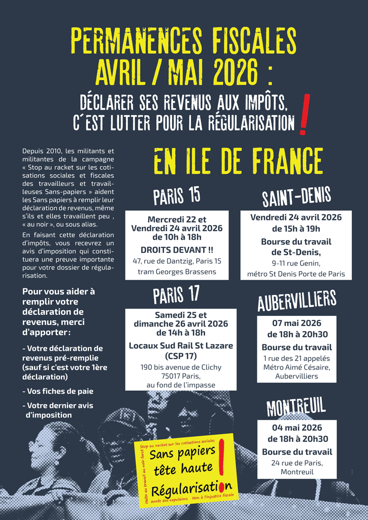Comme chaque année, Solidaires Finances Publiques participera à l’organisation des permanences fiscales des Sans-papiers dans le cadre de la campagne « Non au racket contre les cotisations sociales et fiscales des travailleurs et travailleuses Sans-papiers ».